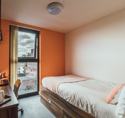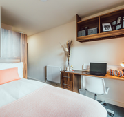 Our Gold Studios come equipped with a double bed, dedicated study space, a sofa, TV, loads of storage, an en suite shower and a private kitchen area.
