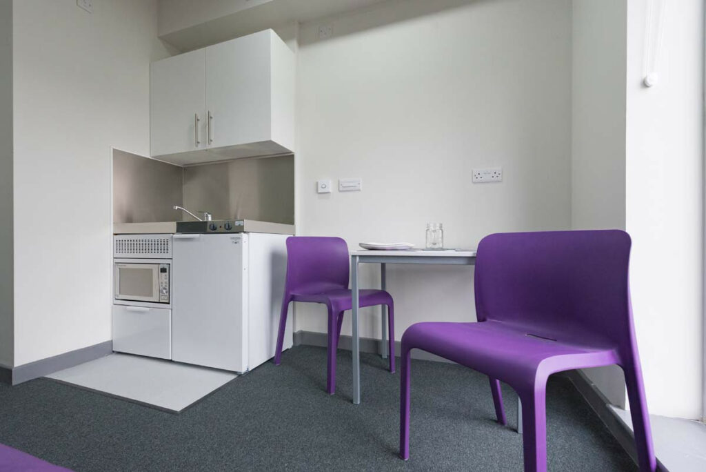 Each studio apartment contains Bed (bedding not included), an En-suite shower room as well as Desk and study chair . Your spacious Wardrobe (with drawers), provides great storage, whilst there are great Kitchen facilities and your own Dining area (table or breakfast bar).