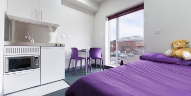 The room has fully fitted kitchenettes, a private bathroom, and a living area with a study desk, and a welcoming environment for student.