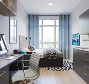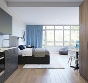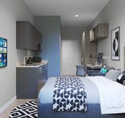 Room sizes may vary from 19.2m2 to 19.8m2 - size double bed with under bed storage - 2-ring hob with extractor - Breakfast bar - En-suite bathroom with shower and WC - Full-length mirror - Integrated fridge with freezer compartment - Microwave oven - Pinboard - Stool - Study desk with drawer space and chair - Wardrobe