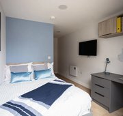 Room Size:- 25.5m2 ¾ size double bed with under bed storage 2-ring hob with extractor Breakfast bar En-suite bathroom with shower and WC Full-length mirror Integrated fridge with freezer compartment Microwave oven Pinboard Stool Study desk with drawer space and chair Wardrobe