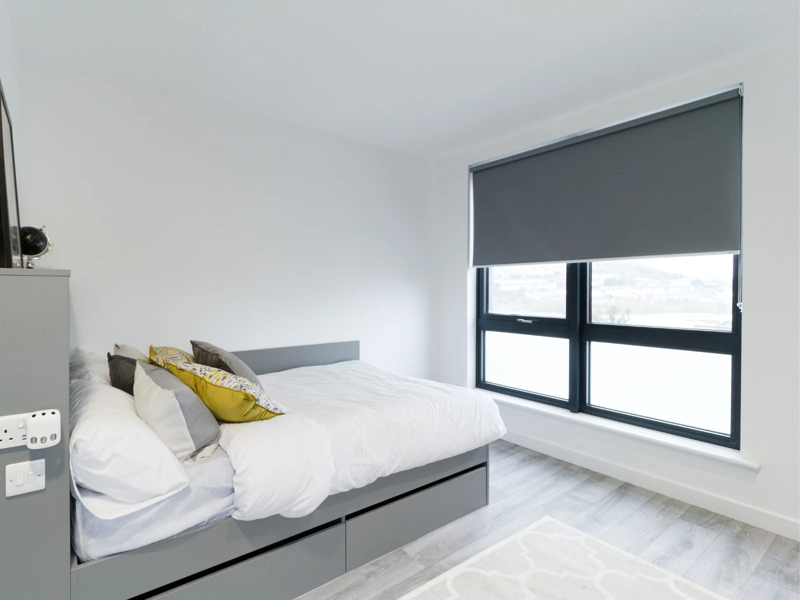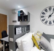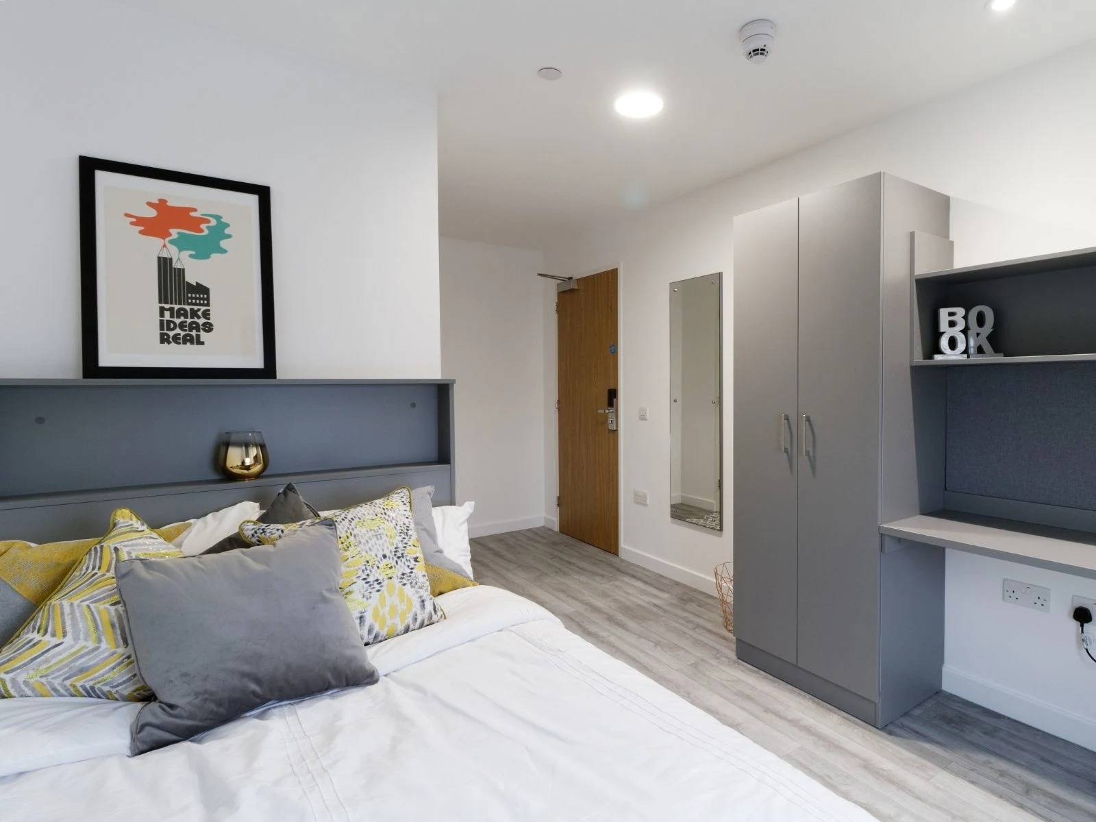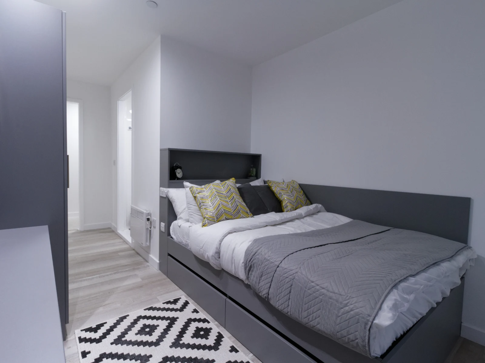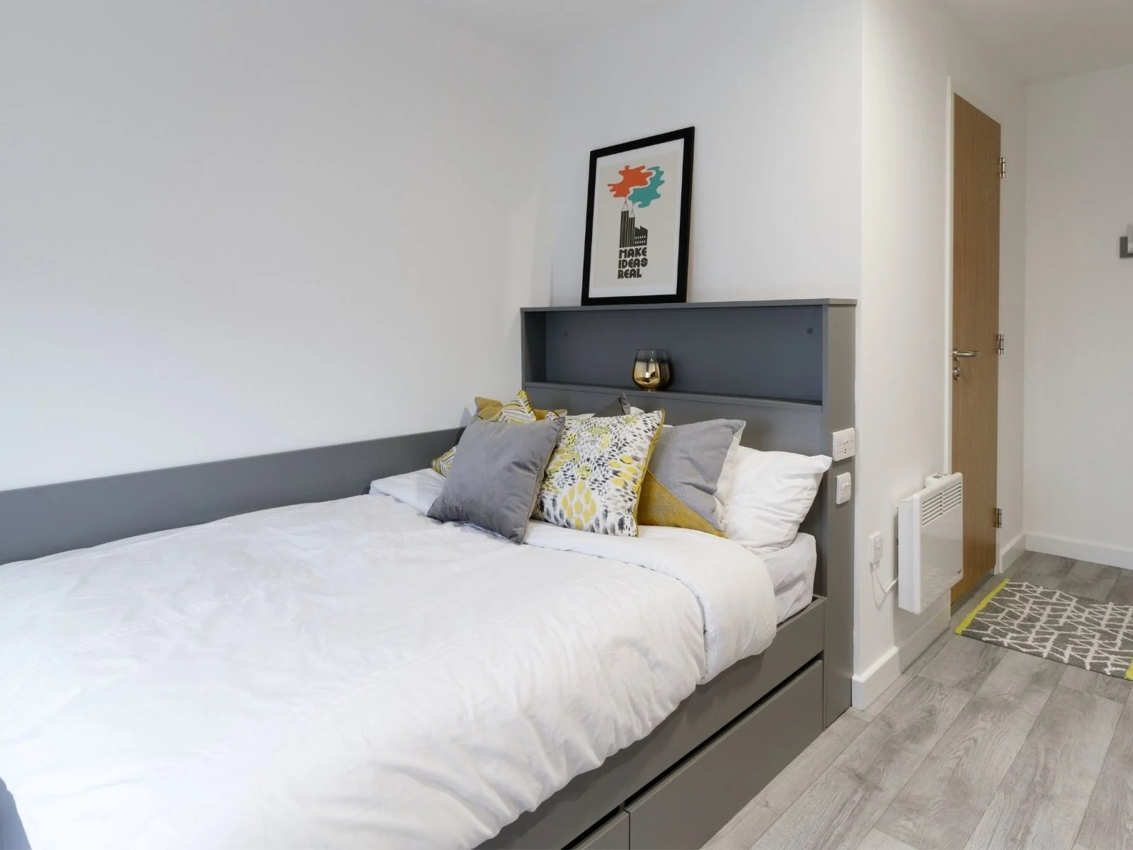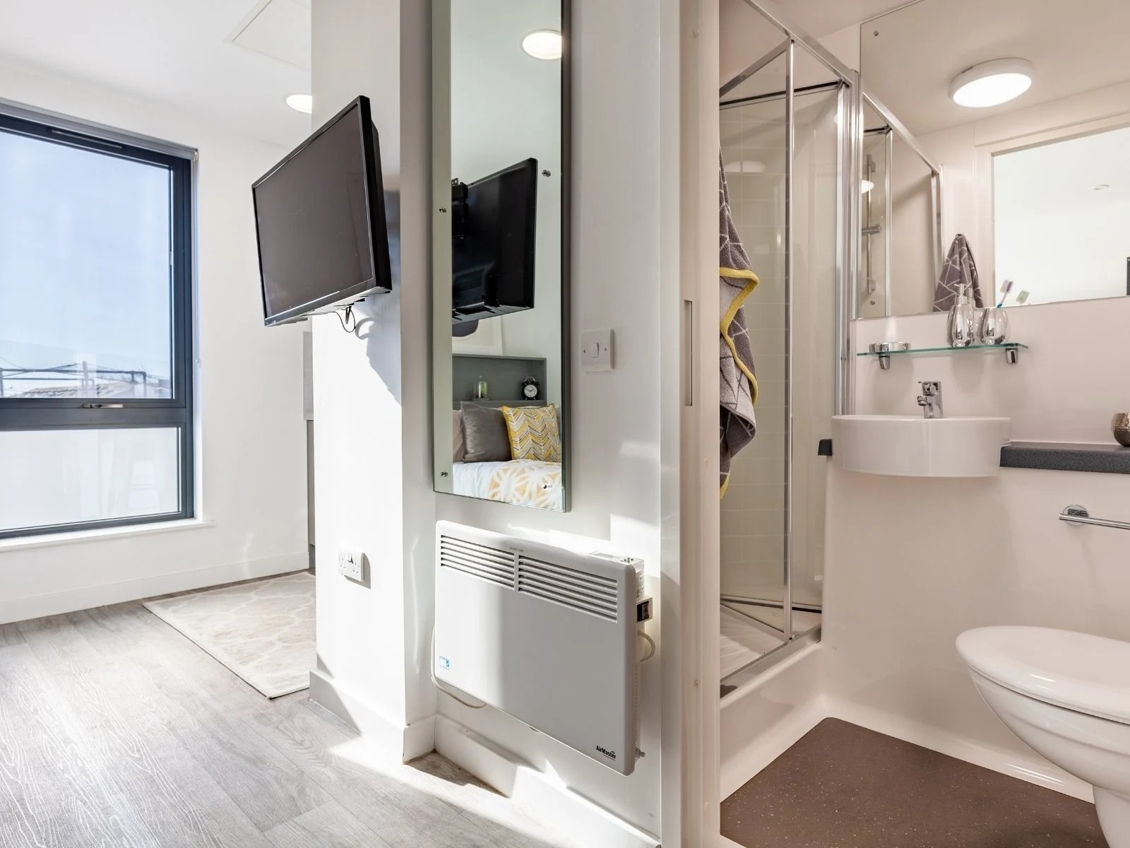 Great affordability with a small double bed alongside your own en suite shower room, study area and loads of storage. Located on the first to fifth floors.