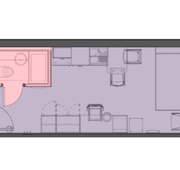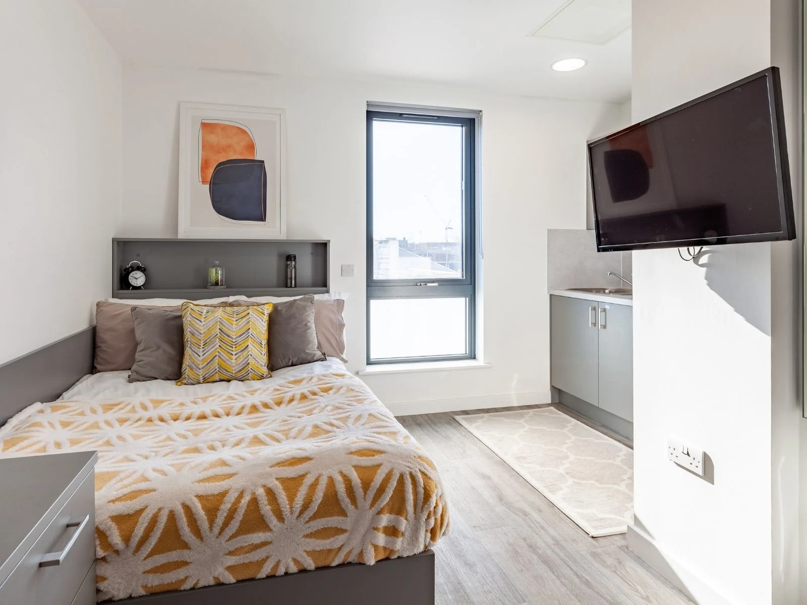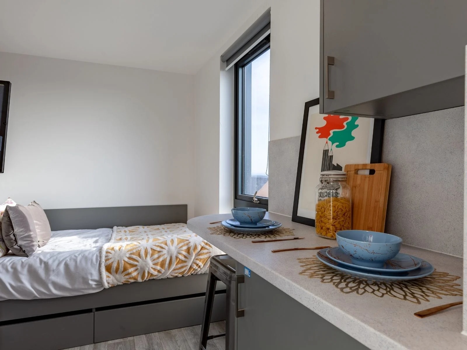 Our largest studios! Your room comes with a small double bed, en suite, great workspace, plenty of space for storage and your own mini-kitchen, plus much more space! Located on the eleventh and twelfth floors.