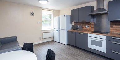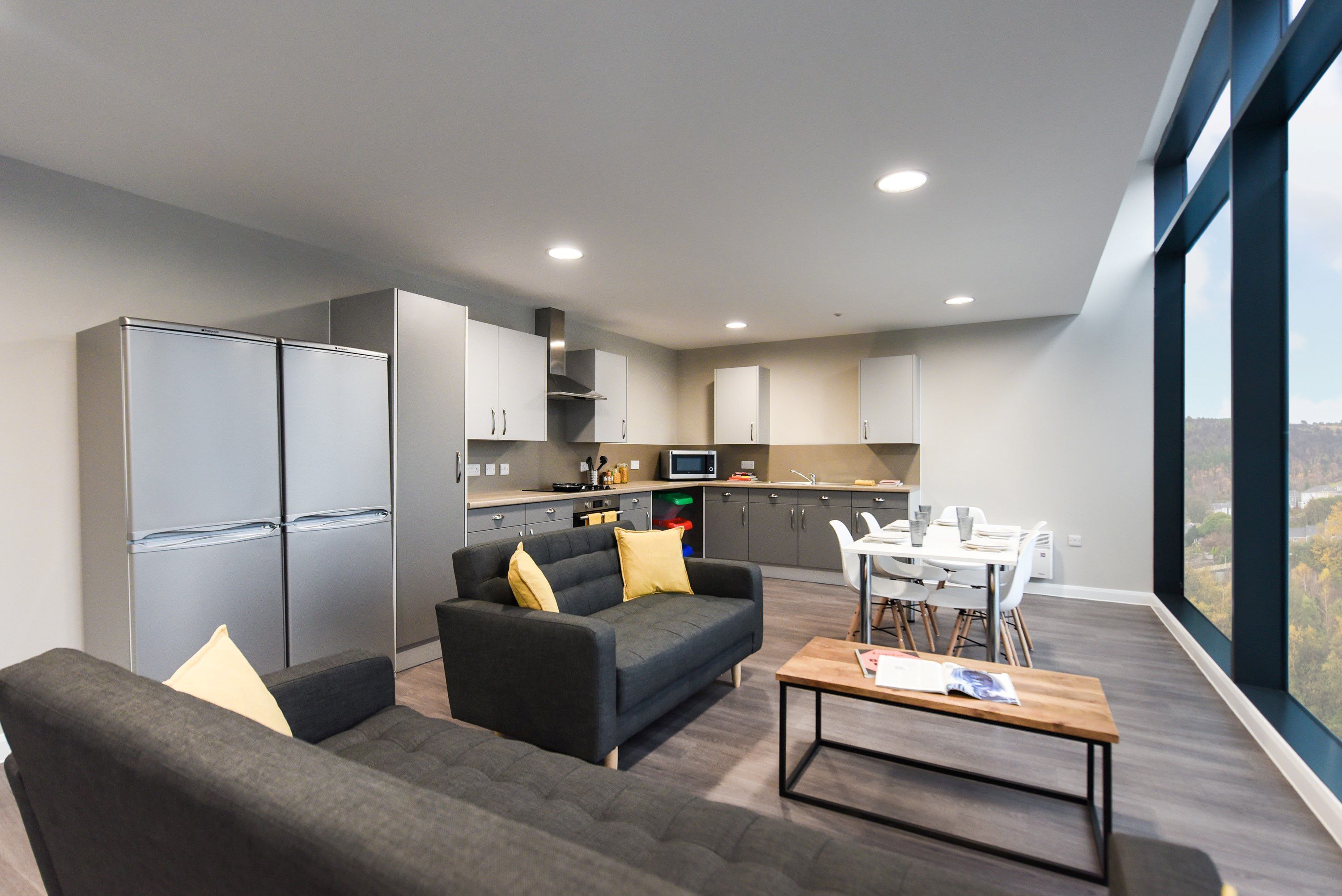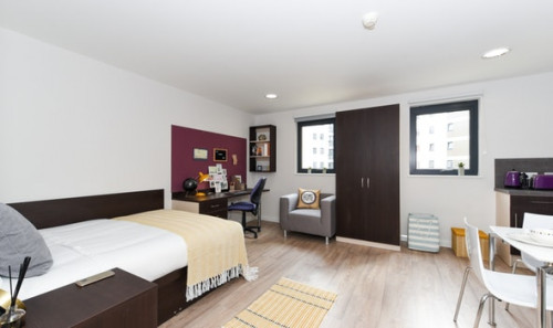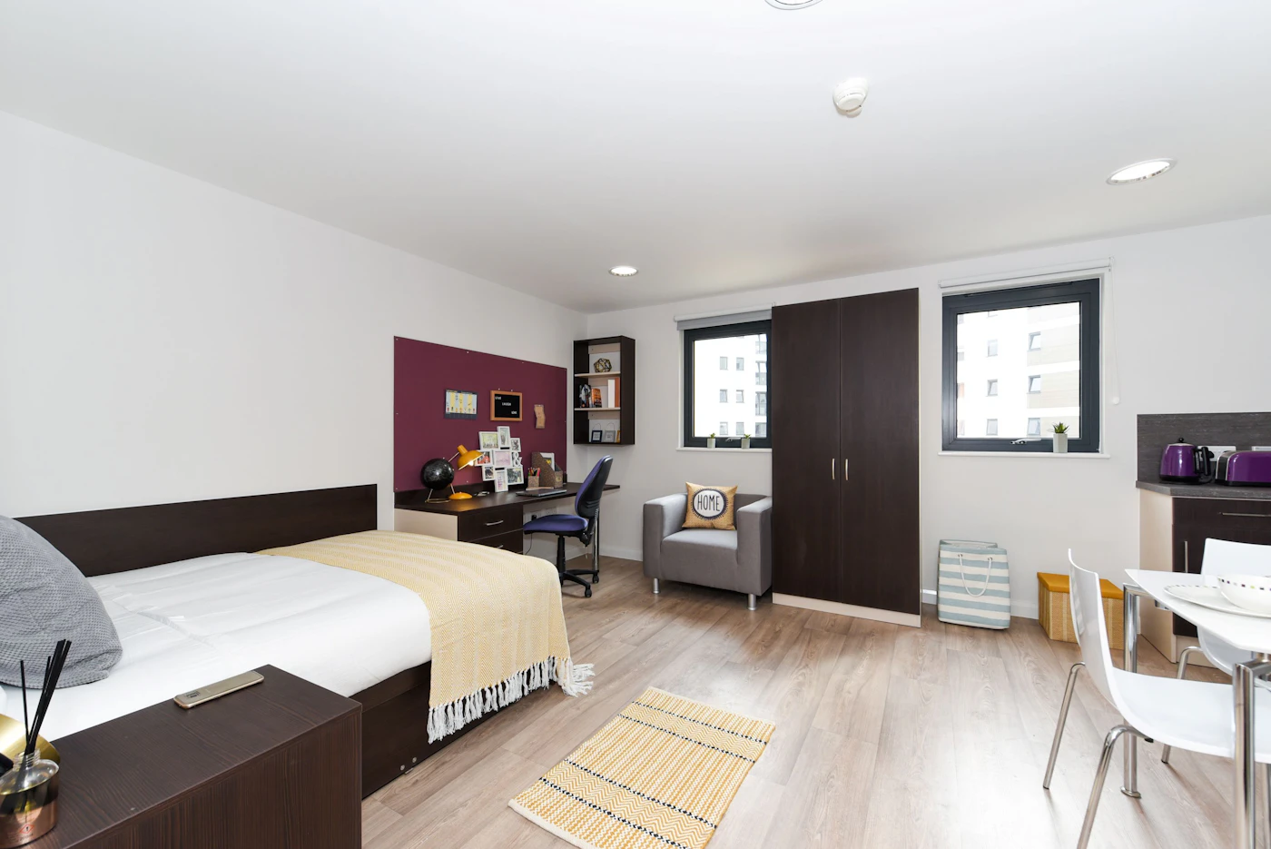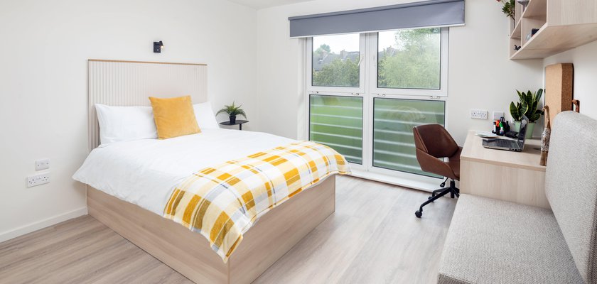 Higher spec room & kitchen En-suite bathroom and shared kitchen & living space with up to 7 other students Bigger windows, larger showers & additional storage in our 'plus' rooms. Approximately 15m² Small double bed En-suite bathroom with double shower, toilet and basin Desk, chair, wardrobe and chest of drawers included in the room.