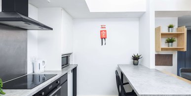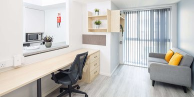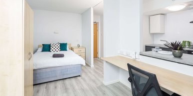 Higher spec room & kitchen En-suite bathroom and shared kitchen & living space with up to 7 other students Bigger windows, larger showers & additional storage in our 'Plus' rooms. Approximately 16.5m² Small double bed En-suite bathroom with double shower, toilet and basin Desk, chair, wardrobe and chest of drawers included in the room