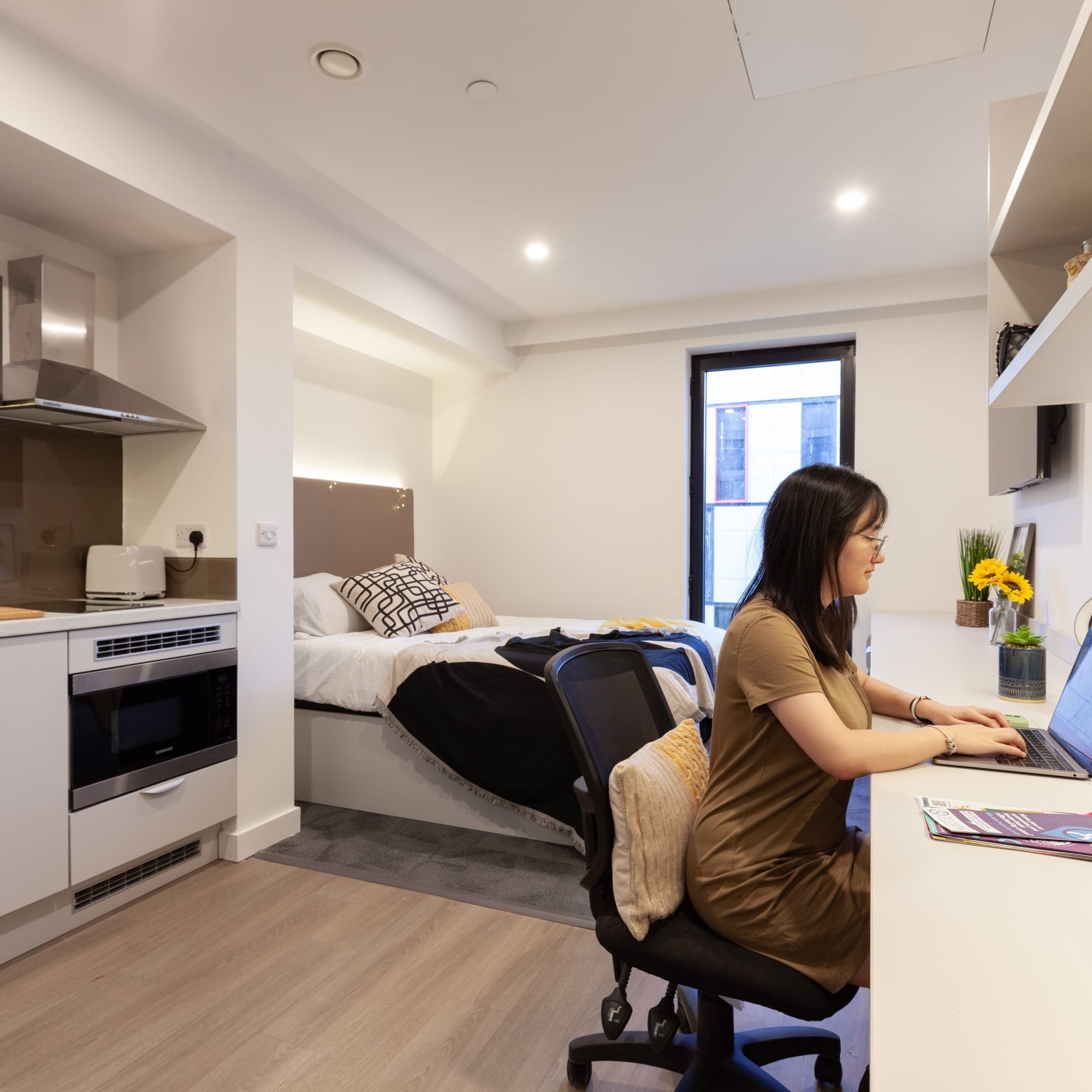 Our studios at true Swansea comprise a double bed, kitchenette, and ensuite bathroom. Our cozy studio rooms are 20sqm in size, so there's plenty of space to store all your essentials!
