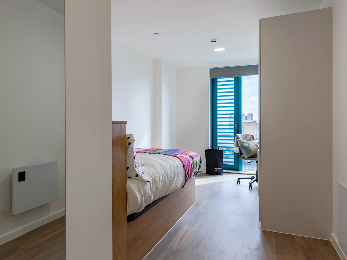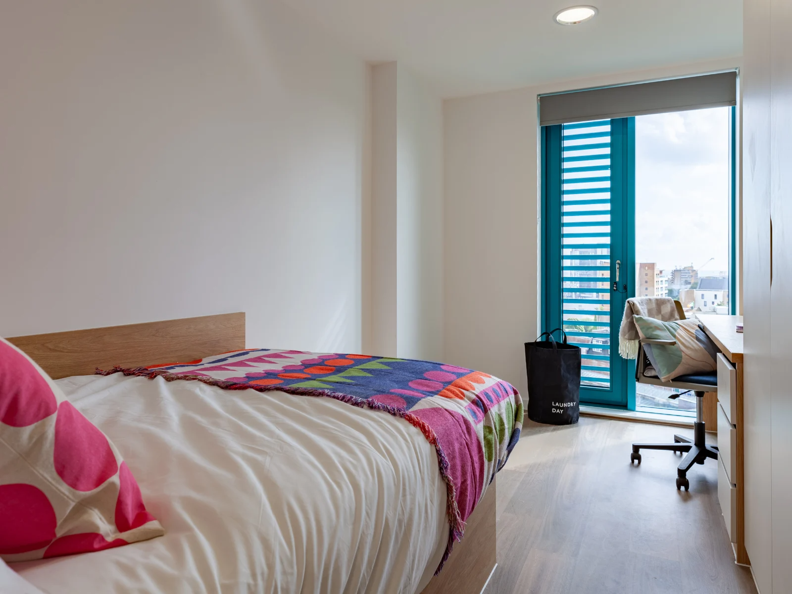 Situated on floor 6. A 15sqm (Approx) en suite bedroom with a small double bed, study space and under bed storage. Enjoy a shared kitchen and living space, equipped with a TV.