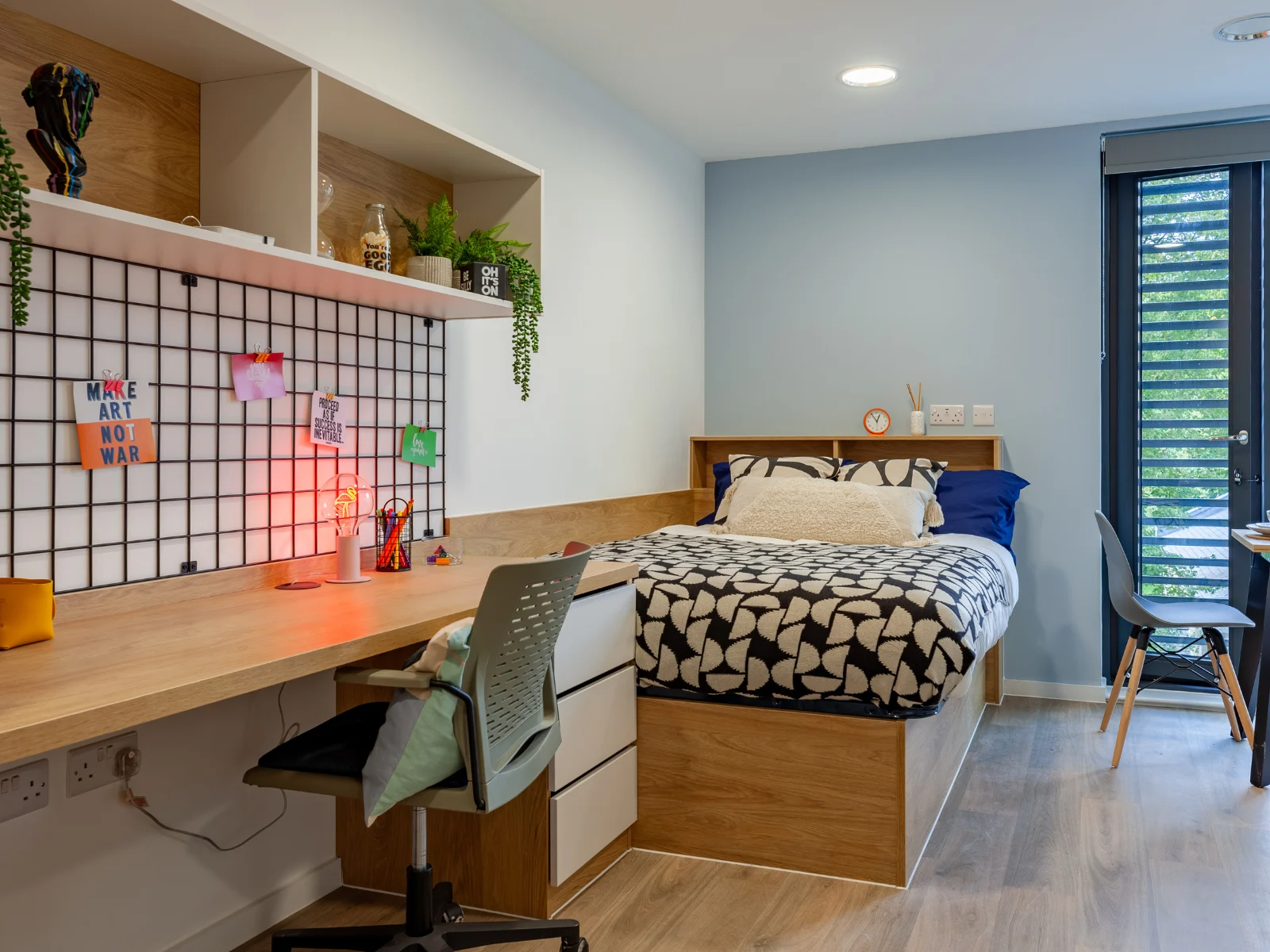 Situated on floors 2 to 5. A 15sqm (Approx) ensuite bedroom with a small double bed, study space and under bed storage. Enjoy a shared kitchen and living space, equipped with a TV.