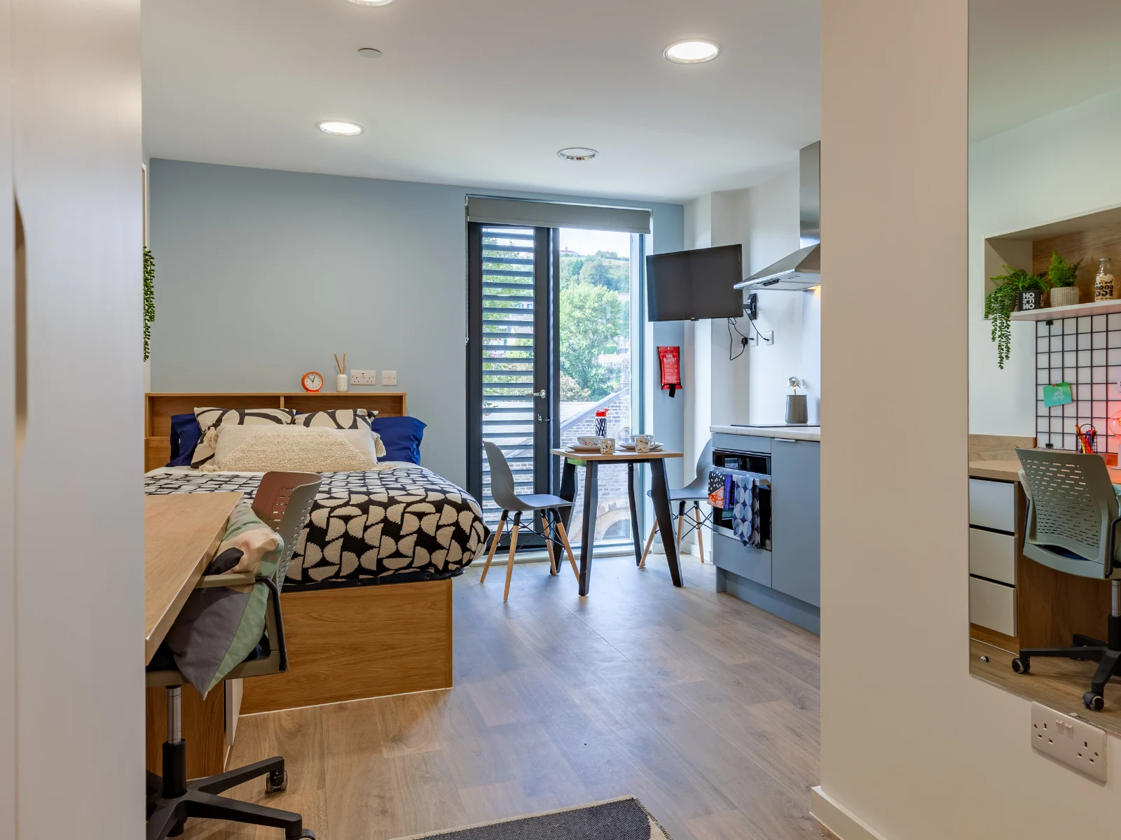 Situated on floors 4 and 5. A 20sqm (approx.) studio bedroom with a small double bed, study space, kitchenette, dining area and under bed storage. Enjoy a self-contained kitchen and living space equipped with a TV. Plus, you can share with a partner for no extra cost!