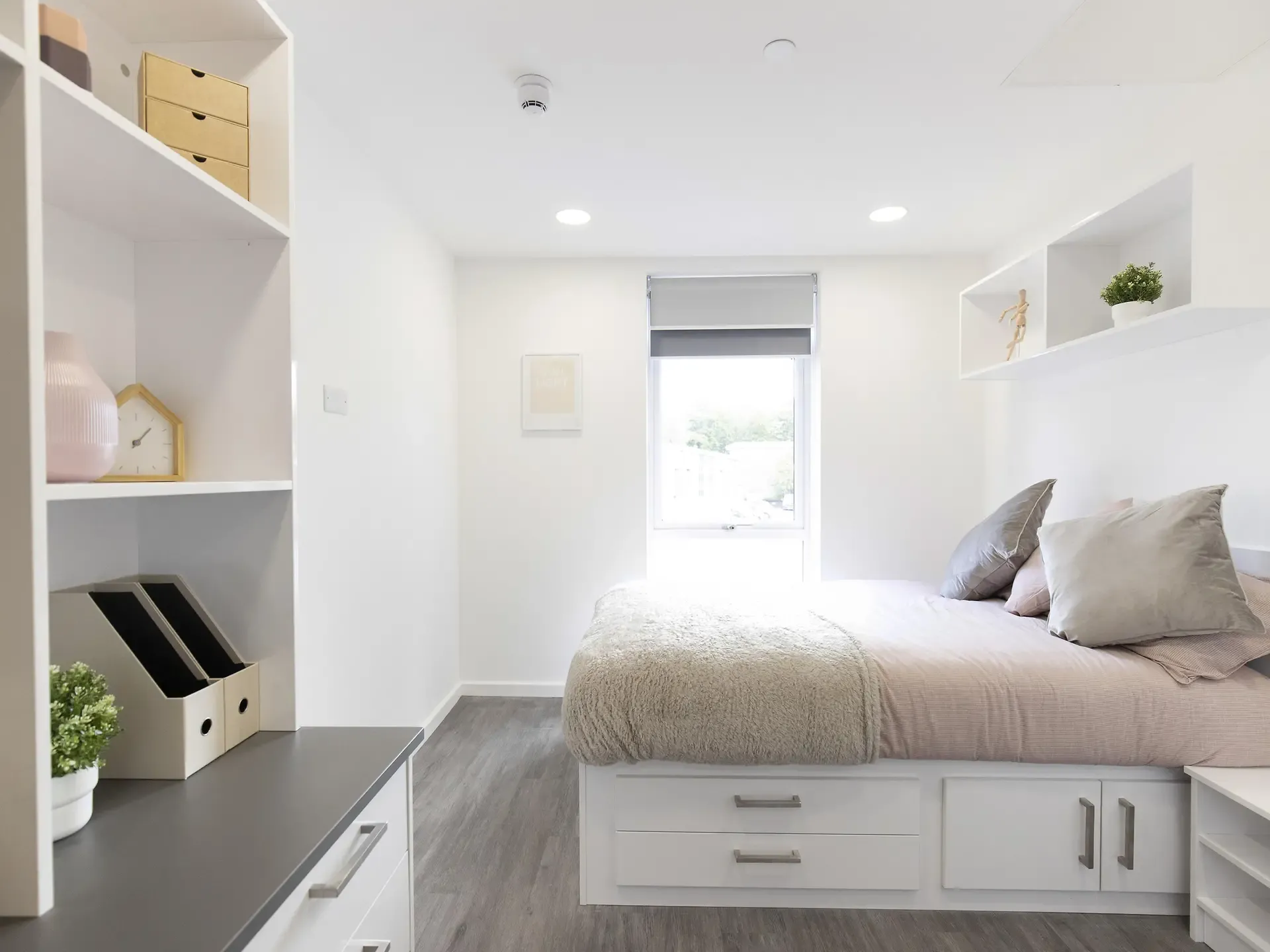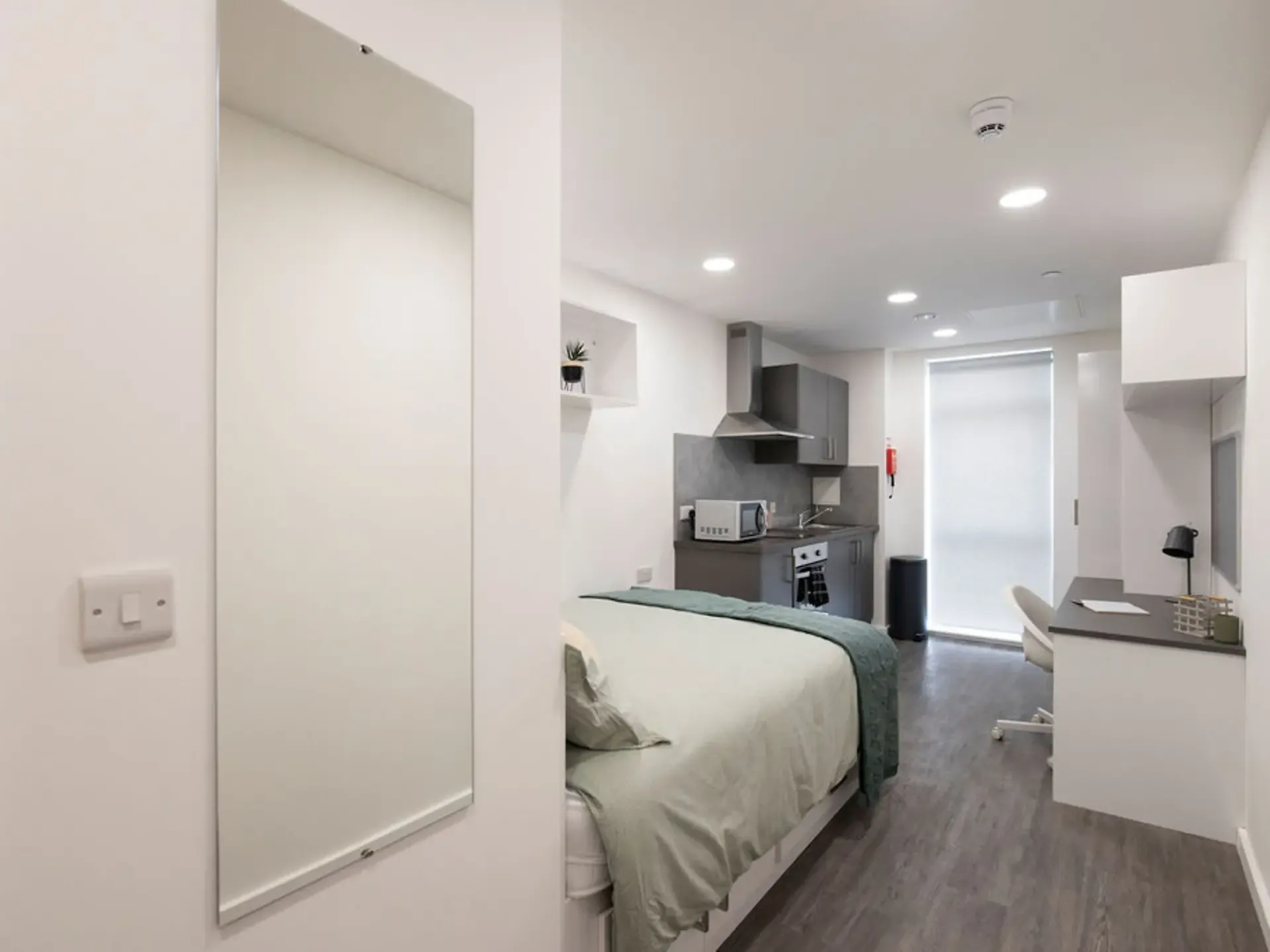 ¾ size double bed with under bed storage 2-ring hob with extractor Bedside tables En-suite bathroom with shower and WC Full-length mirror Integrated fridge with freezer compartment Microwave oven Pinboard Sink Study desk with drawer space and chair Wardrobe
