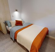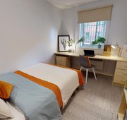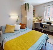 FIVE100-031125If you’re looking for more of an apartment feel with extra space and all the facilities you could want, these flats for two are perfect. Each bedroom comes with full-size double bed, study desk and chair, lots of storage and hardwood floors. You’ll share a bathroom and open-plan living room and kitchen with your housemate, featuring a big, comfy corner sofa, TV and dining table and chairs.