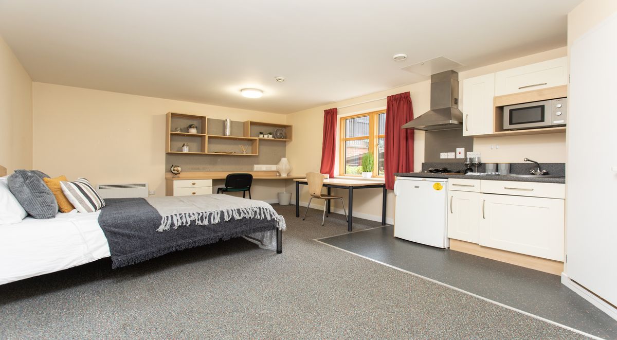 The premium studio is still available, contact us directly to book. The Premium Studio offers a larger than average studio for students requiring their own space, 28-36m2. With a double bed, study desk and your own bathroom and fully equipped kitchenette, the Premium Studio is a great choice for students who want independence and comfort in.