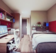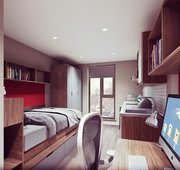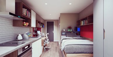 Self-contained studio with bedroom kitchen, breakfast bar and bathroom Dual occupancy available Small double bed Underbed storage, wardrobe, personal study space with desk and chair. Self-contained kitchen and bathroom 18 - 20m² approximately
