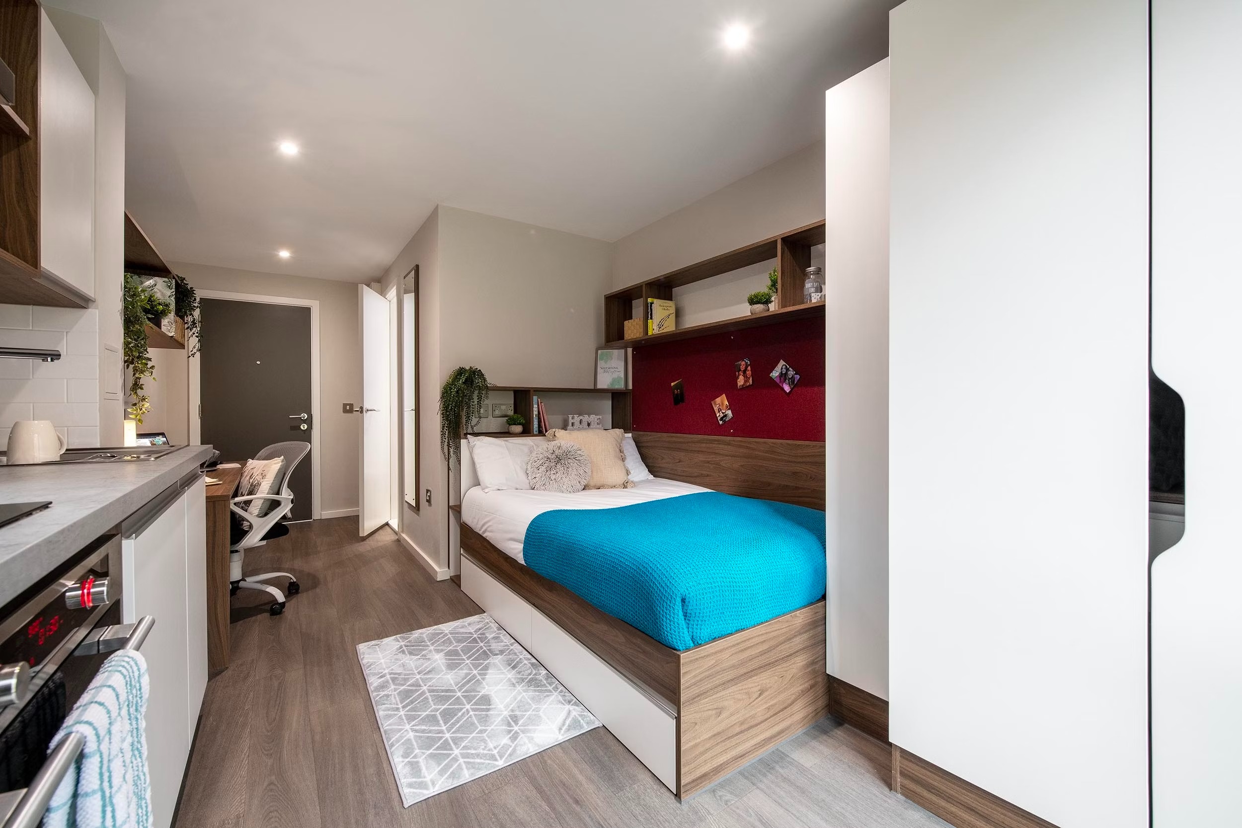 Self-contained studio with bedroom kitchen and bathroom Double bed Underbed storage, wardrobe, personal study space with desk and chair. Self-contained kitchen with breakfast bar and bathroom. 34m² approximately