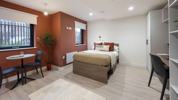 The Accessible Studio combines privacy and accessibility in a stylish and functional layout. It includes a cosy bed, a study desk and chair, and a private washroom designed for ease of use. A spacious wardrobe provides ample storage, while the private kitchen, equipped with essential appliances, allows you to cook and dine at your convenience. This studio is ideal for students looking for independence.